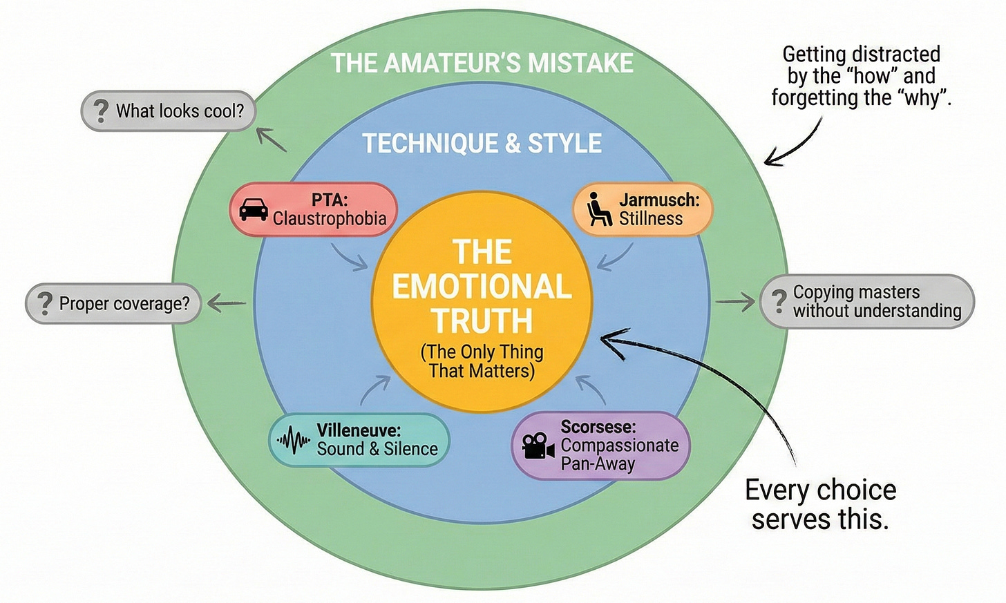PTA locks us in the car because claustrophobia is the point. Jarmusch lets a scene breathe because character revelation doesn’t need plot mechanics. Villeneuve orchestrates sound and silence because action is emotional, not just physical. Scorsese pans away because compassion sometimes means not watching. Kon uses stillness because constraint creates weight.