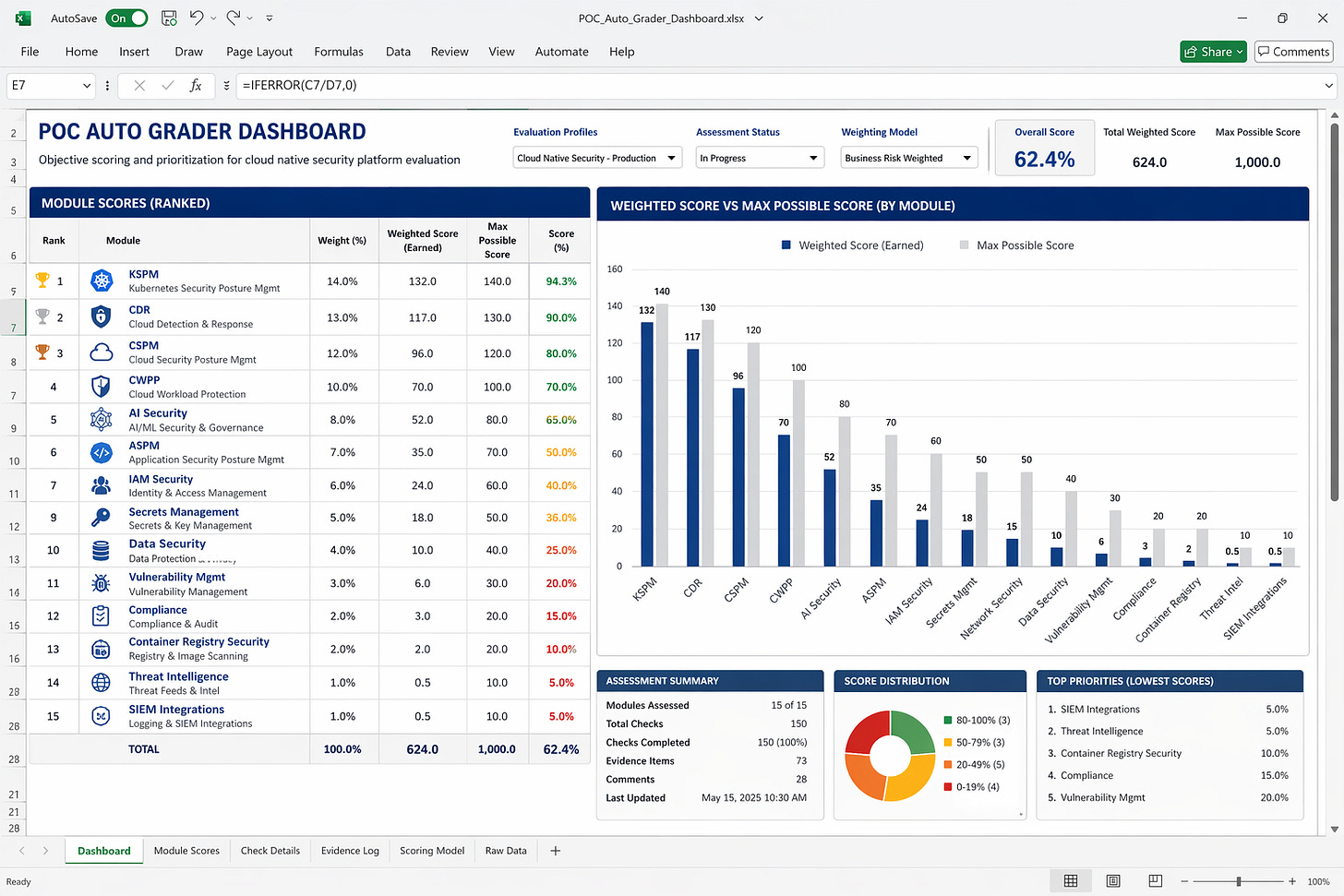 The dashboard chart puts weighted score and max possible side by side for all modules. One glance gives the ranking.