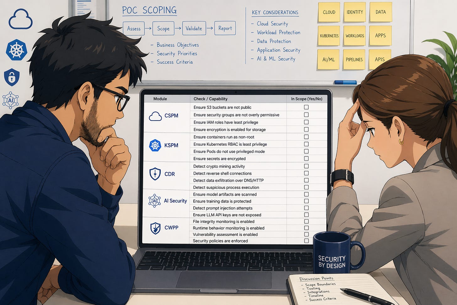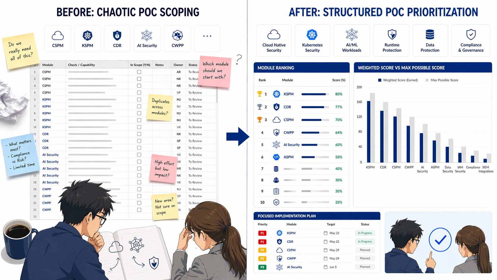 8/8. CDR is8/8. AI Security is27/50. Start with KSPM and CDR. Move AI Security deep dive to week two.”