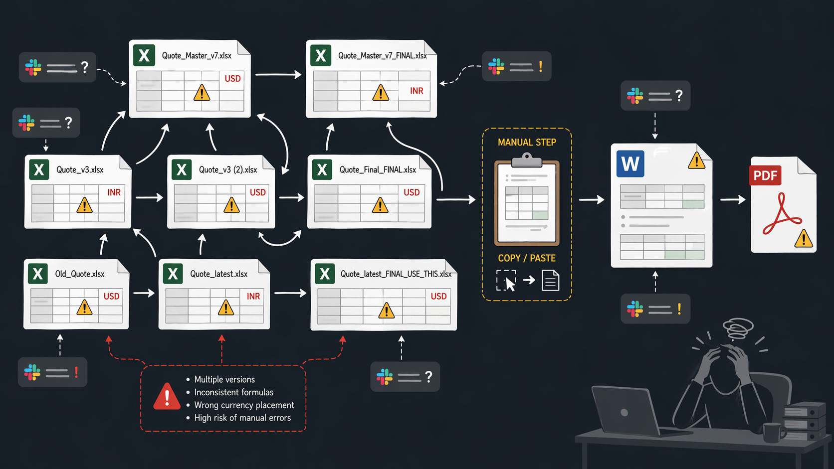 Version sprawl alone was enough reason to replace the process. Files named Pricing_v3_FINAL.xlsx, Pricing_v3_FINAL_USE_THIS.xlsx, and Pricing_v3_clientname_v2.xlsx lived across Slack and inboxes. Two reps quoting the same prospect from two versions was normal.
