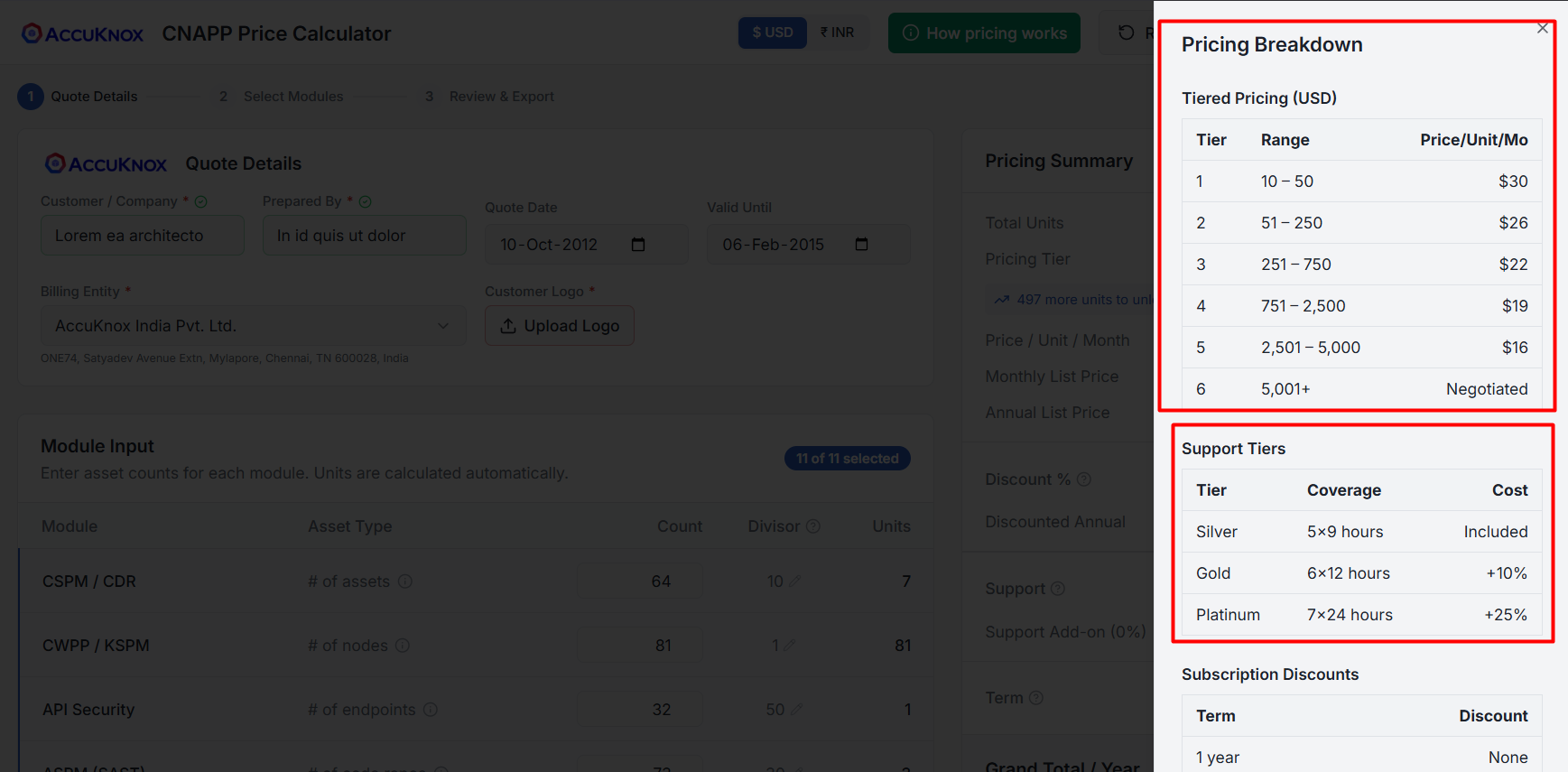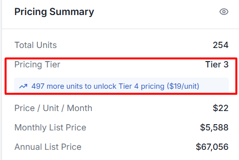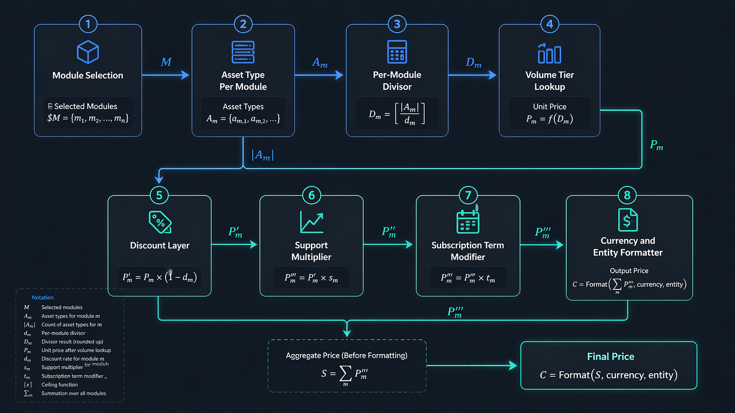 Volume tiers: Normalized units across all selected modules rolled up to one total. That total set the tier, and the tier set per-unit rate across the whole quote. One extra module could shift pricing for everything.