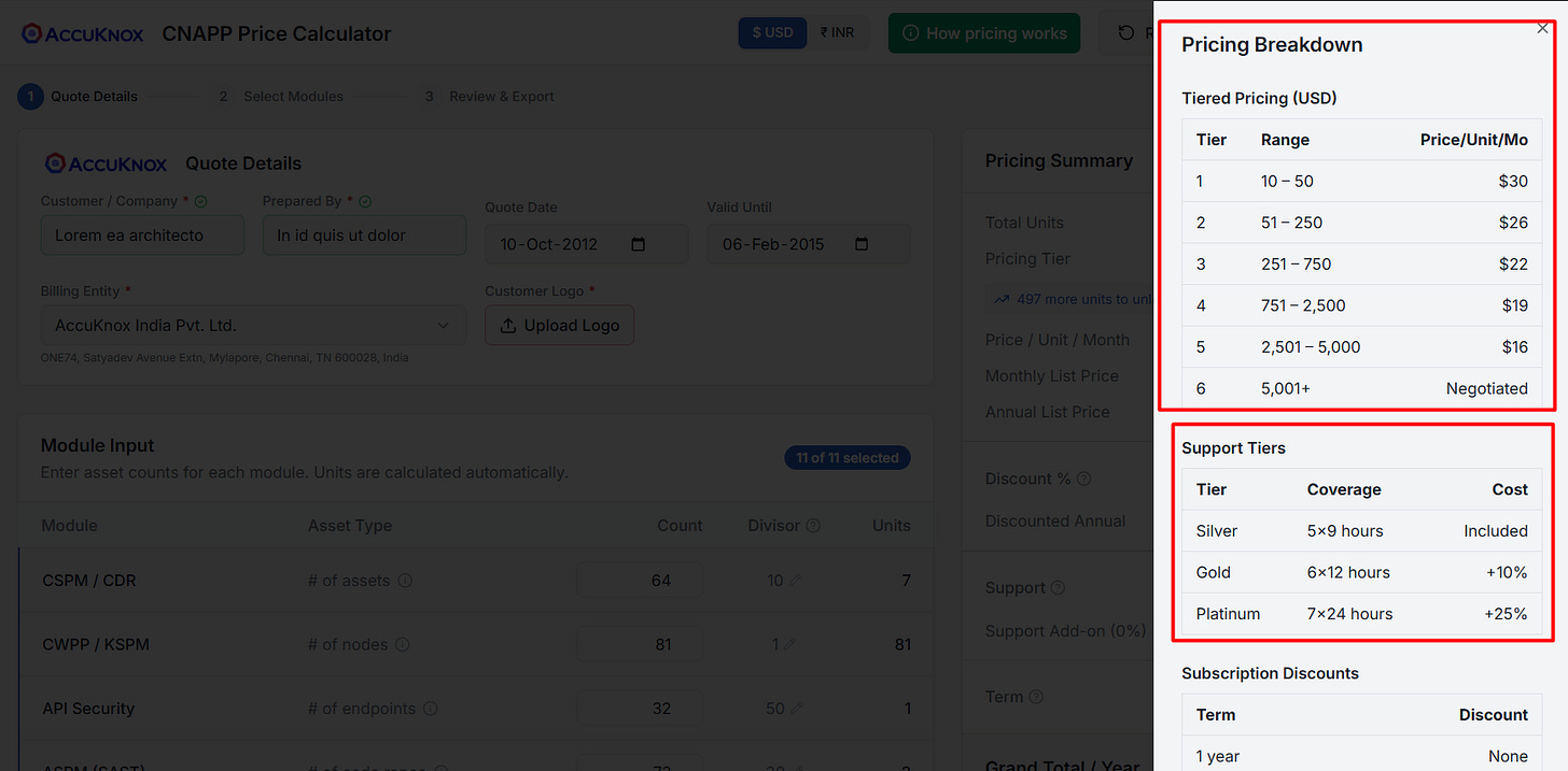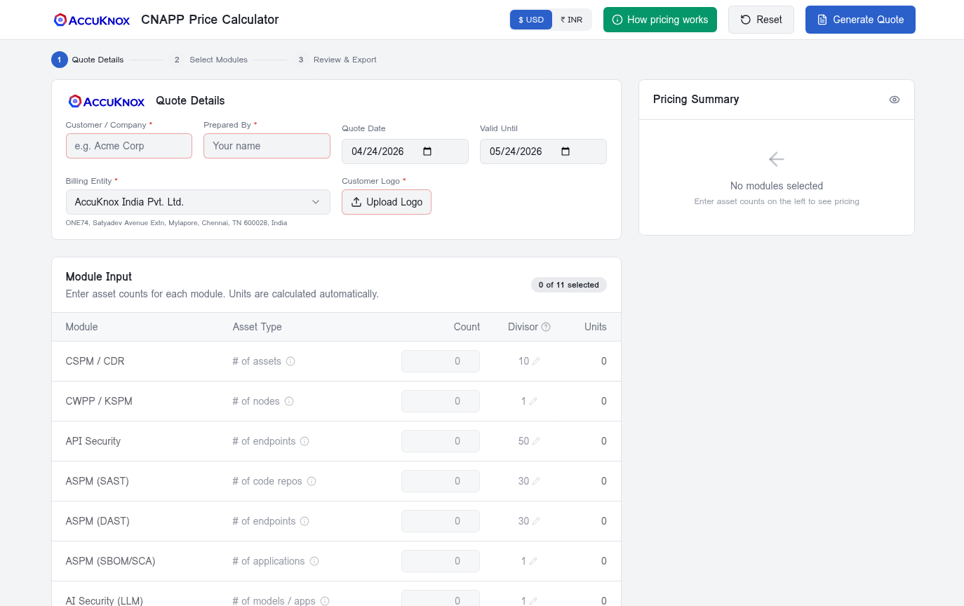 I collapsed it into one choice. Select AccuKnox India Pvt. Ltd., and currency, formatting, address, and legal text all switch automatically.