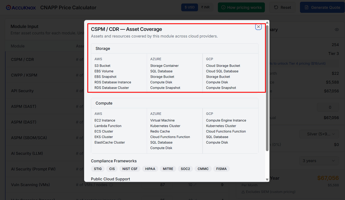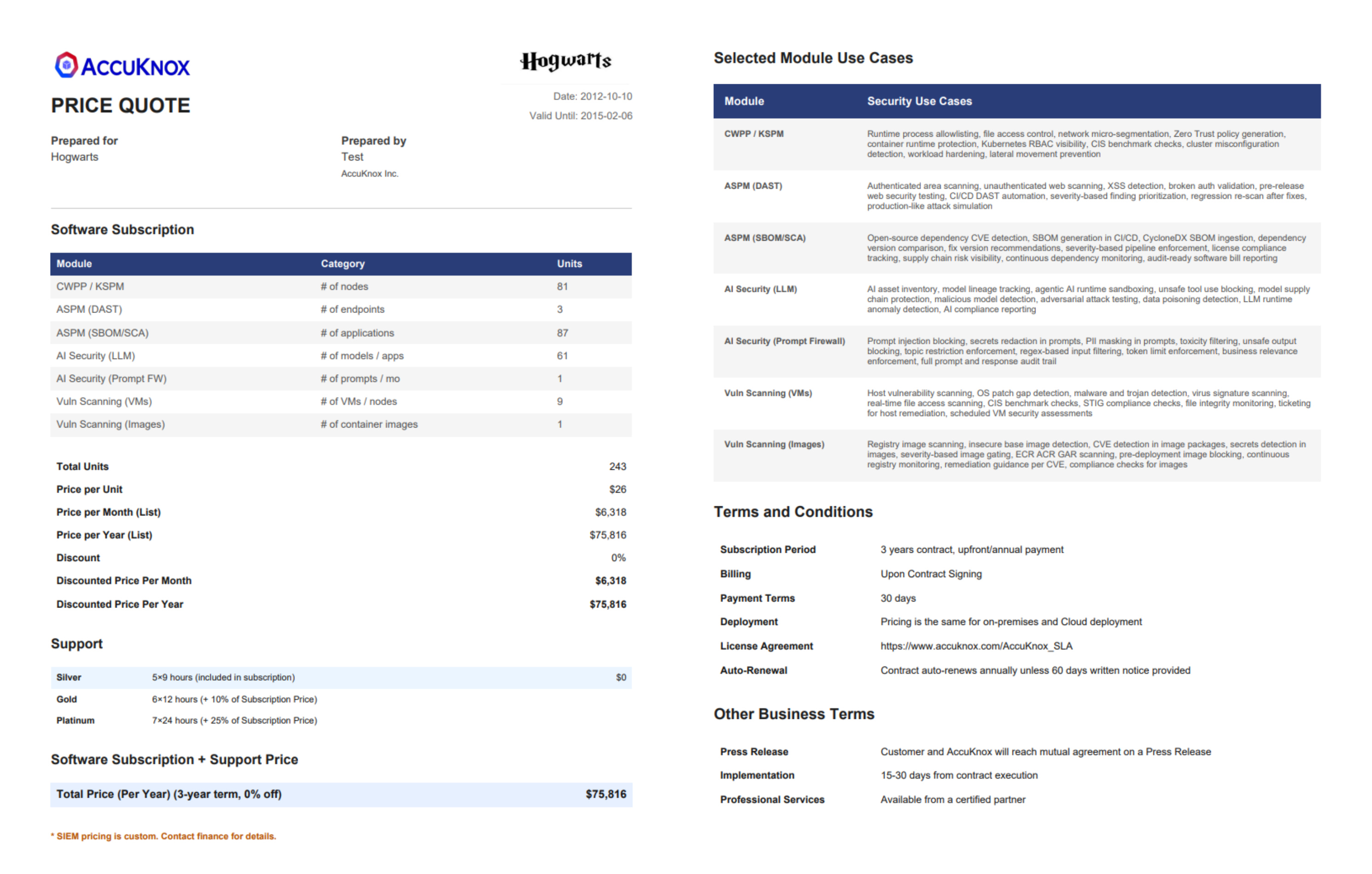 Billable unit per module: There was no universal seat model. Billing could be assets, nodes, endpoints, repos, apps, AI models, prompts per month, container images scanned, or GB ingested per day.
