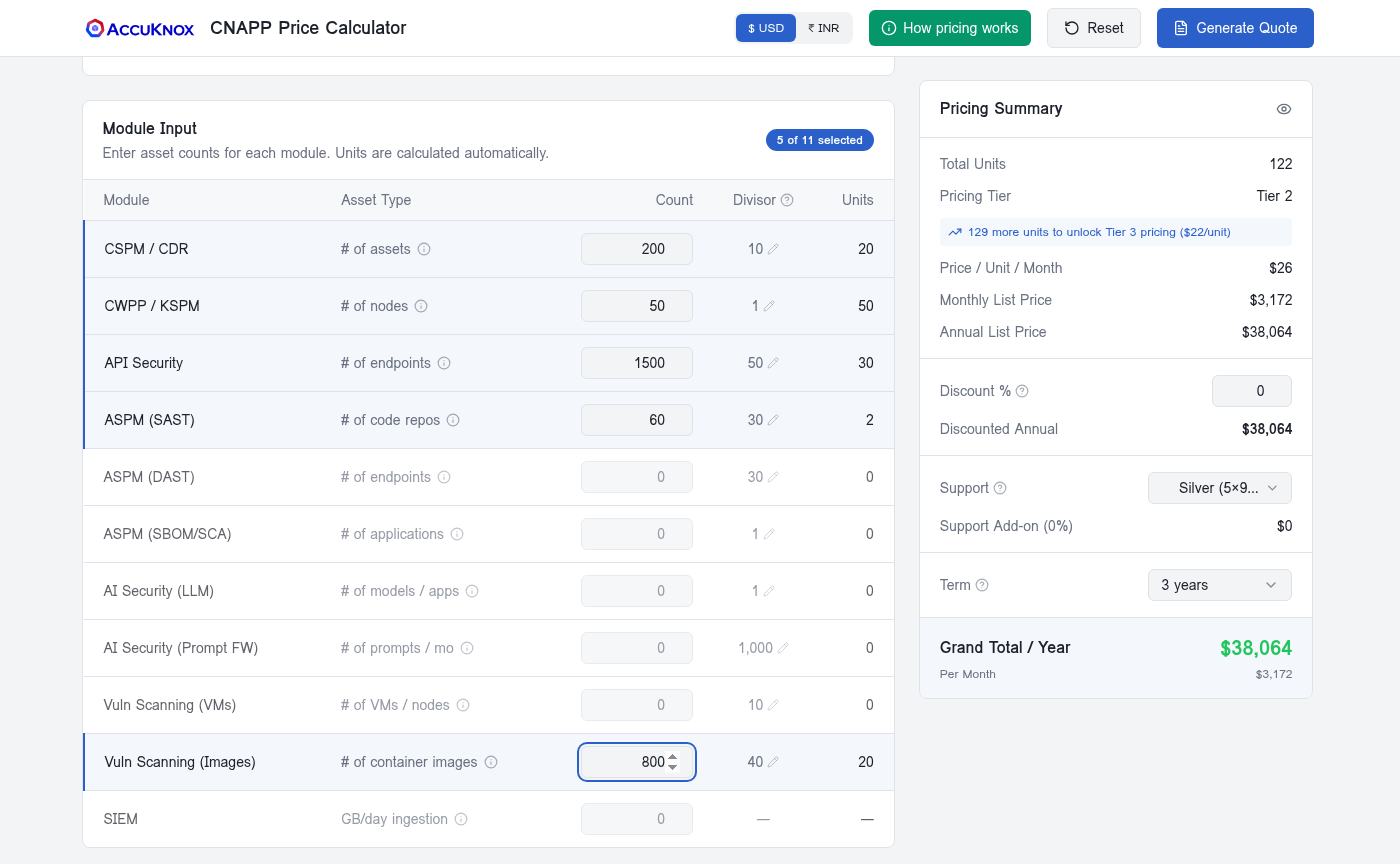 Total units are summed across selected modules. That single total sets the tier. The tier is quote-wide, not per module.