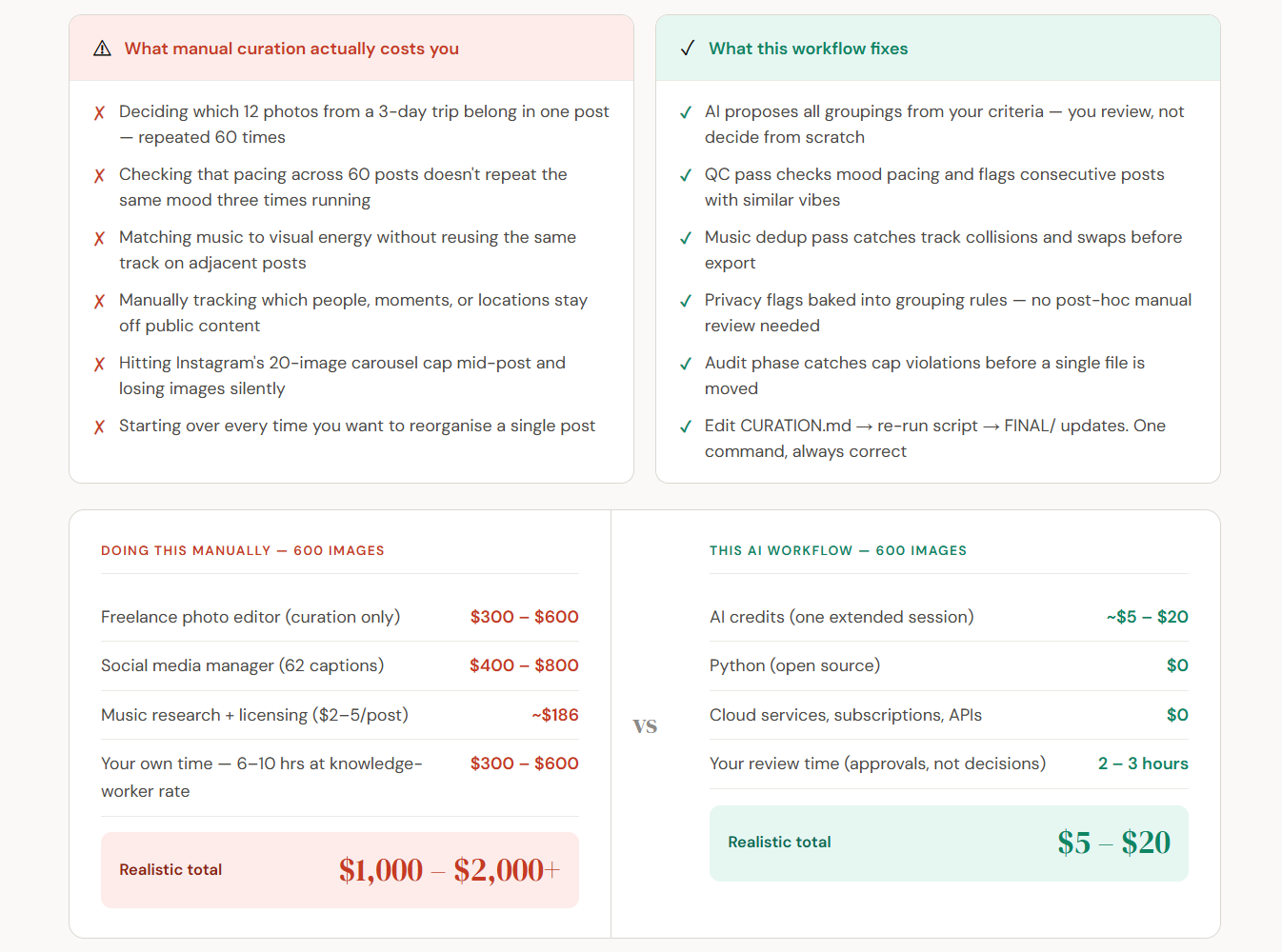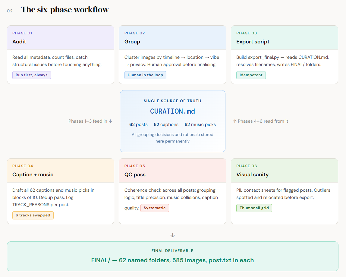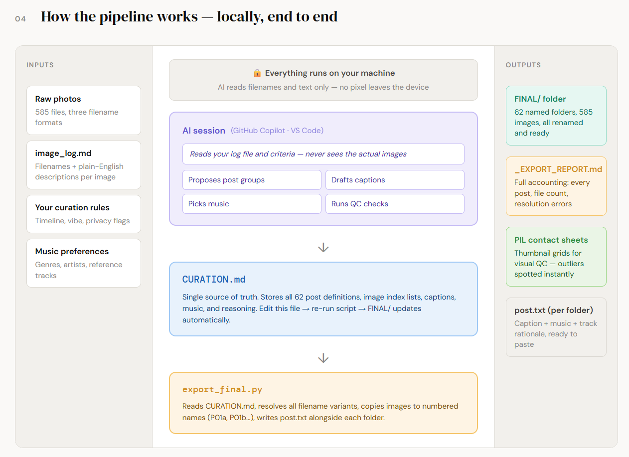 The next time I do a photo dump, I run the same prompt architecture. The script already handles all my filename variants. I update MANUAL_INDEX_TO_FILE for any new unlogged batch, update CURATION.md, and run export_final.py. The entire workflow is reproducible.