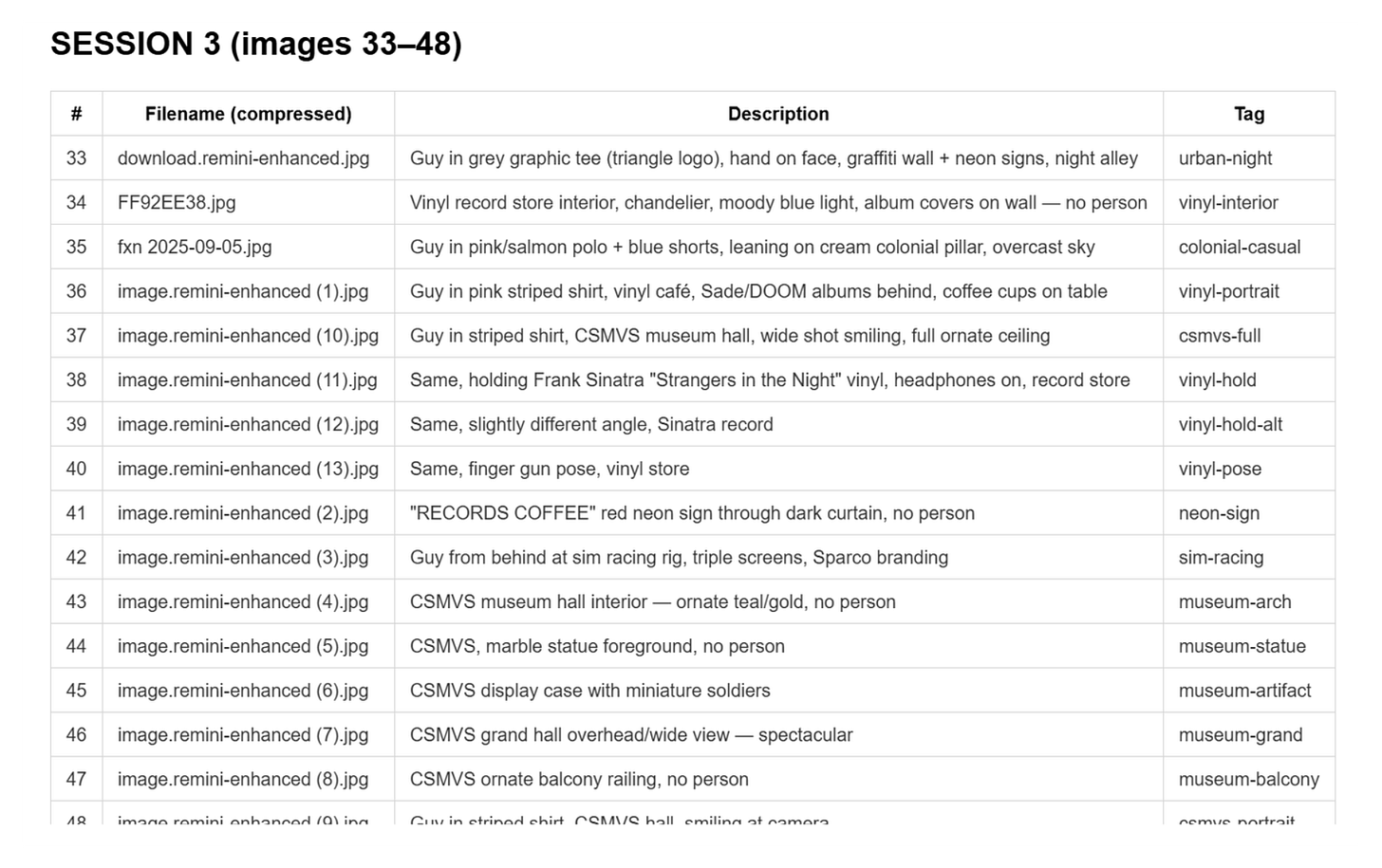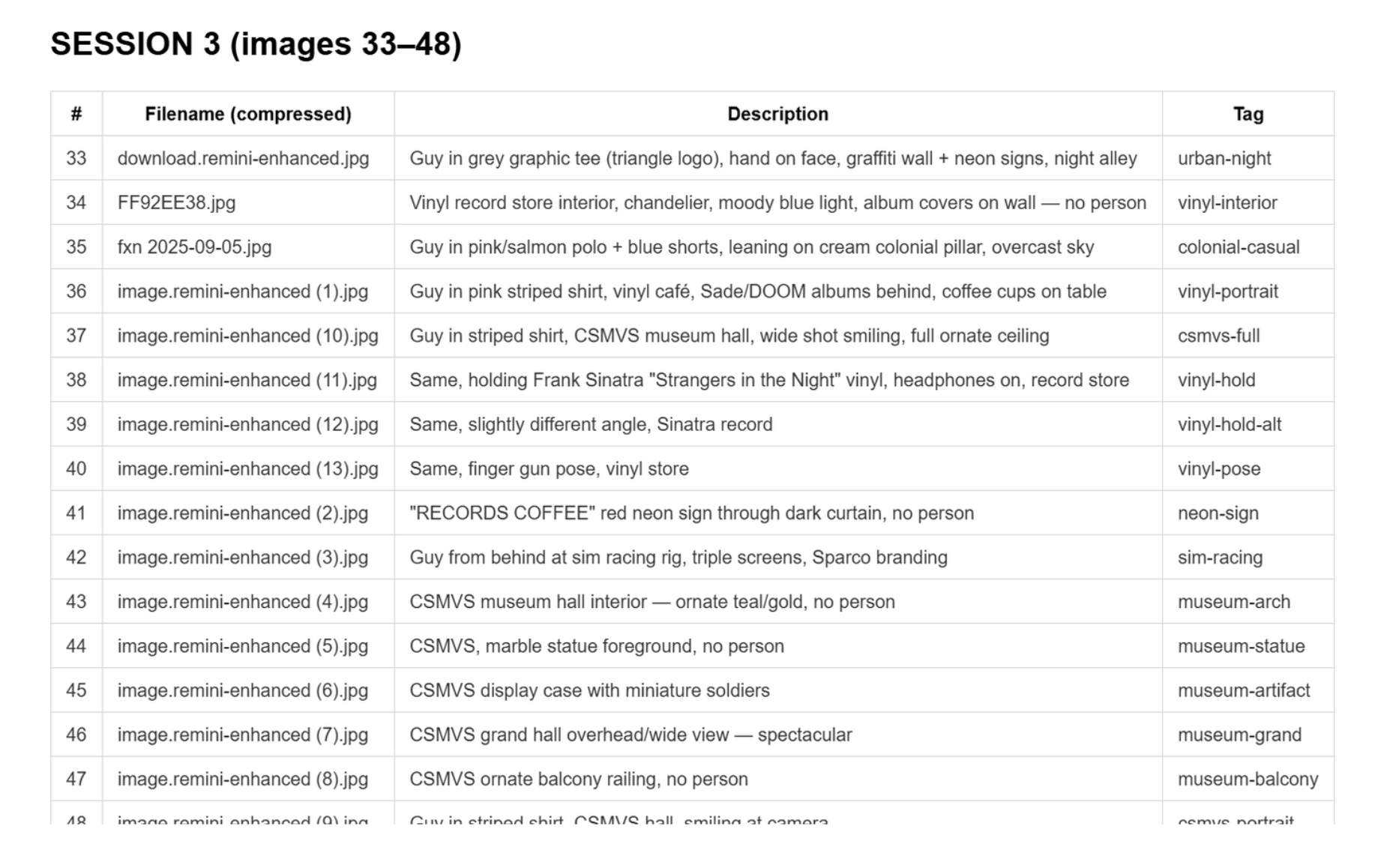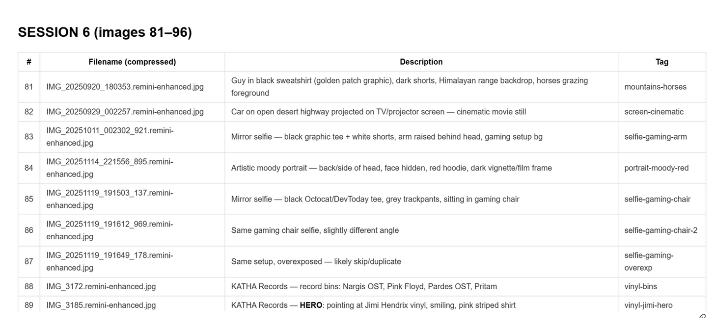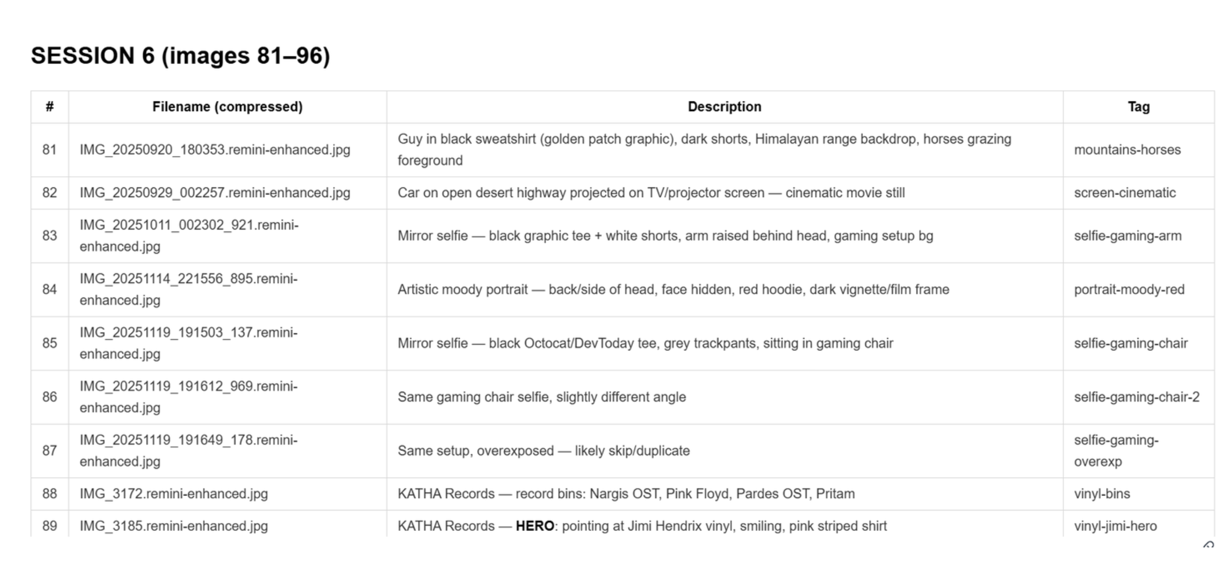 The next time I do a photo dump, I run the same prompt architecture. The script already handles all my filename variants. I update MANUAL_INDEX_TO_FILE for any new unlogged batch, update CURATION.md, and run export_final.py. The entire workflow is reproducible.