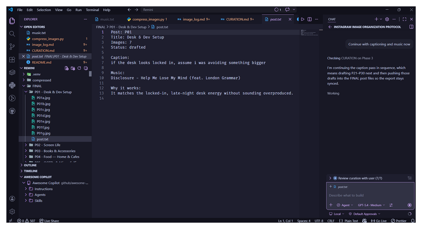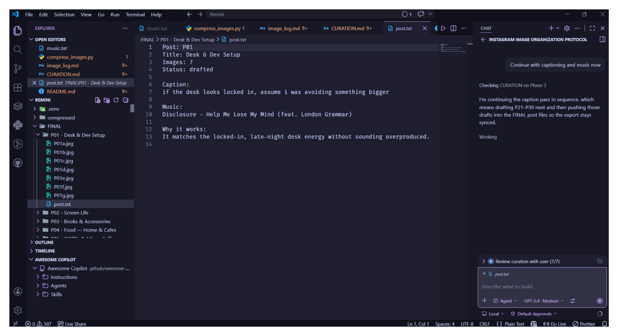CURATION.md→ run the script → the change is live in FINAL/Move an image to a different post → run the script → the folders reflect it instantly