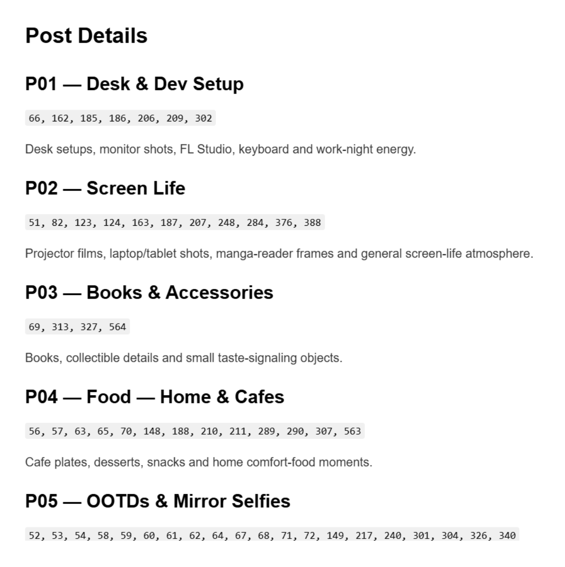 For the two most uncertain posts, P60 (Early Heritage & Portrait Archive) and P62 (Early Interiors, Culture & Misc Vibes), we generated PIL contact sheets: a grid of all images in the post rendered at thumbnail size.