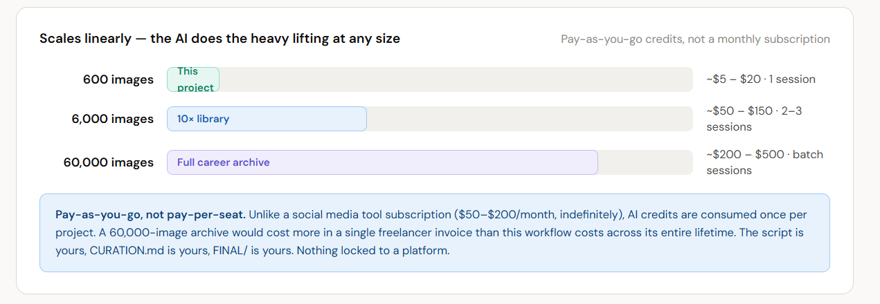 The same workflow works for 100 images or 5,000. The export script handles filename chaos gracefully. CURATION.md can nest, extend, and reorganize. The QC pass scales with automated checks before the human visual review.