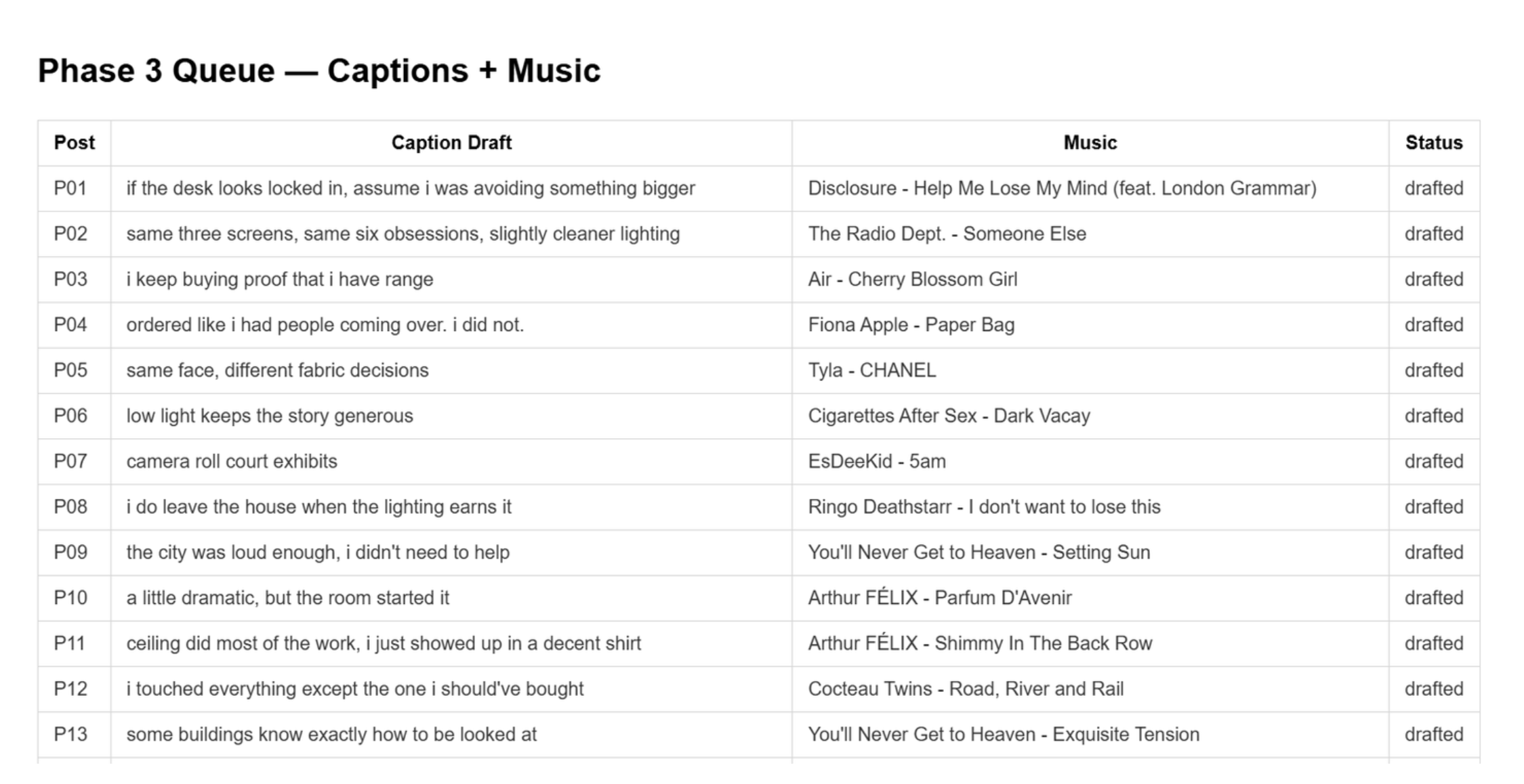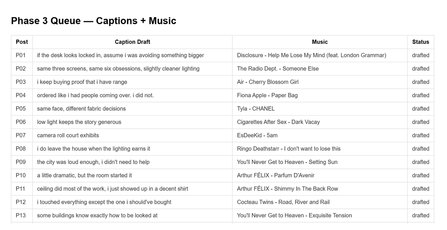 A TRACK_REASONS dictionary was written into the export script for every post, explaining why the music works. This becomes a useful memory artifact: when you’re posting months later and you’ve forgotten the session, the rationale is right there.