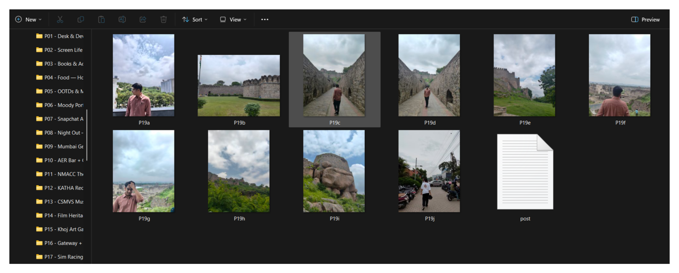 Within seconds of viewing the contact sheet, two images jumped out as visually incoherent with the rest of P60. A white fabric close-up and a lakefront scene had snuck in alongside Jantar Mantar stonework and Mughal architectural portraits. They were moved to P62, which had a looser, more eclectic brief anyway.