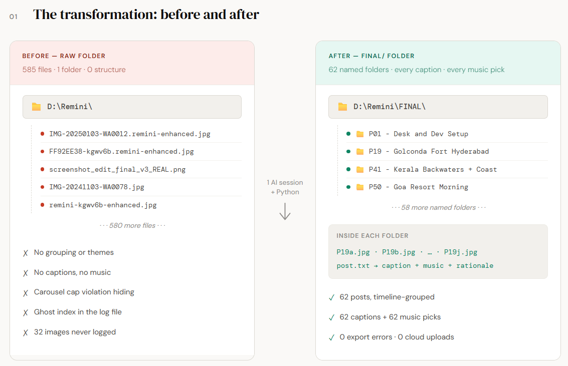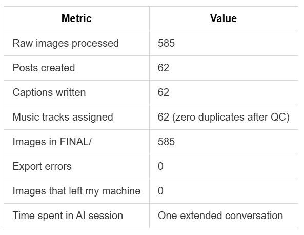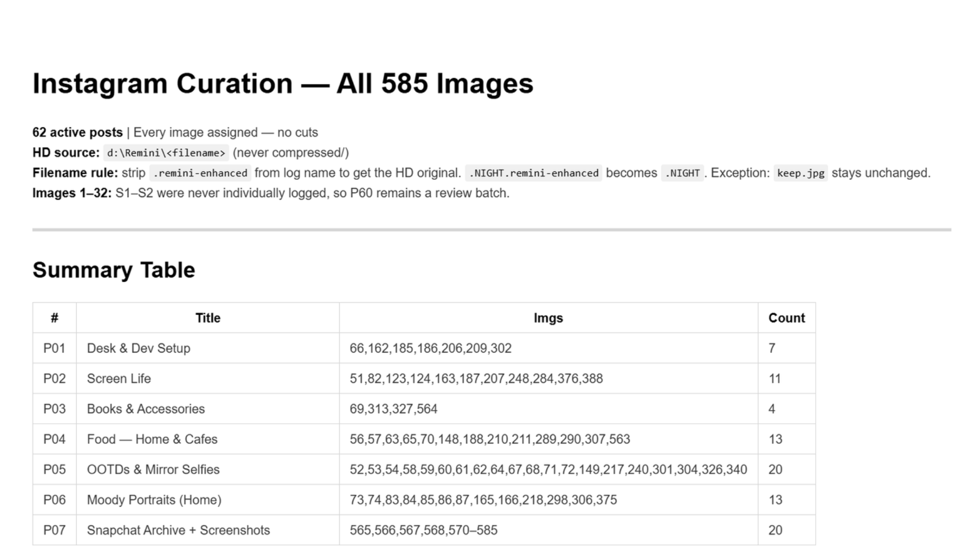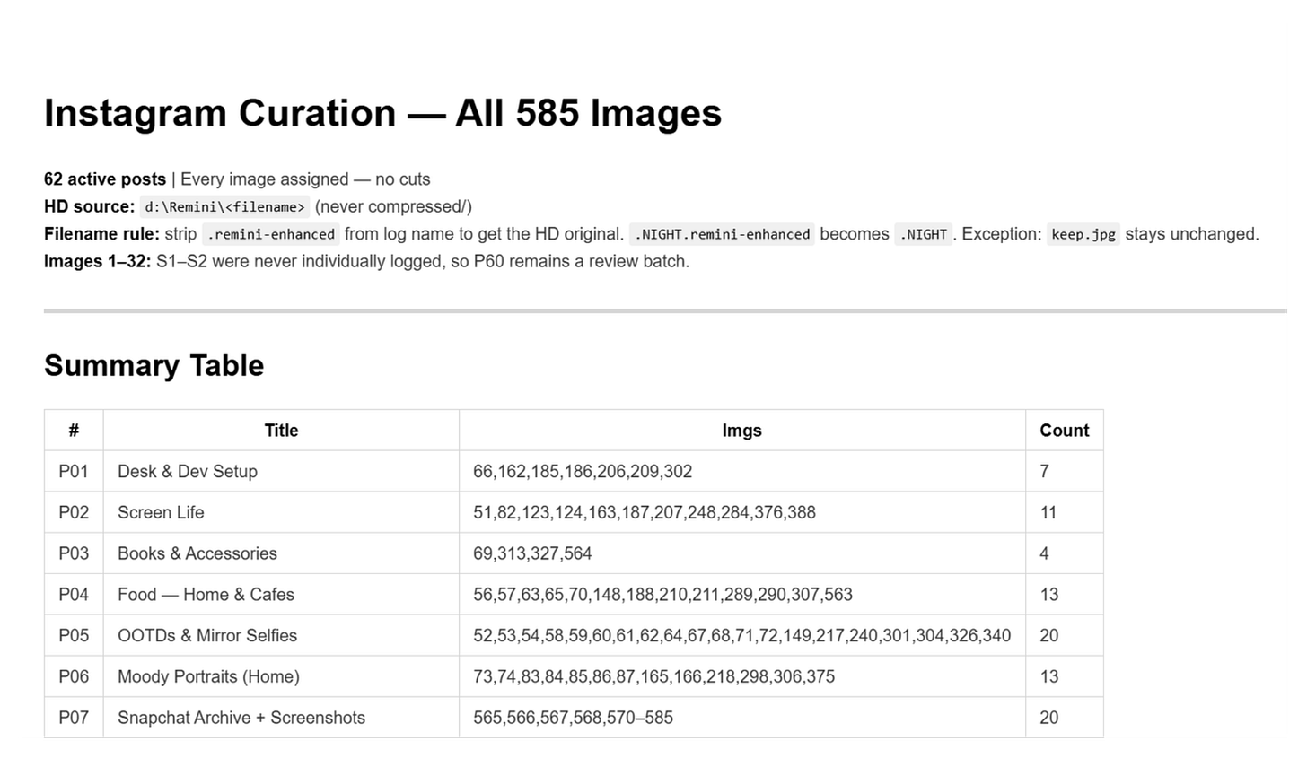 The AI proposed 60 posts initially. After the audit, that became 62 (two splits, plus resolving a 32-image unlogged batch into two dedicated archive posts).