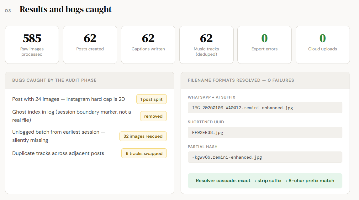 This audit phase saved me from shipping a broken export. The Instagram carousel would have silently dropped 4 images. The ghost index would have caused a file-not-found error at export time. Neither of these would have announced themselves without a deliberate check.