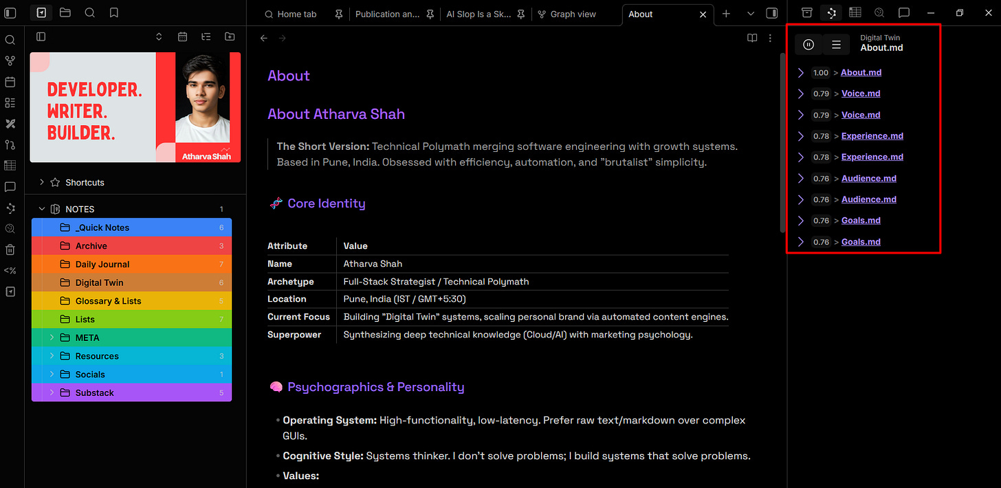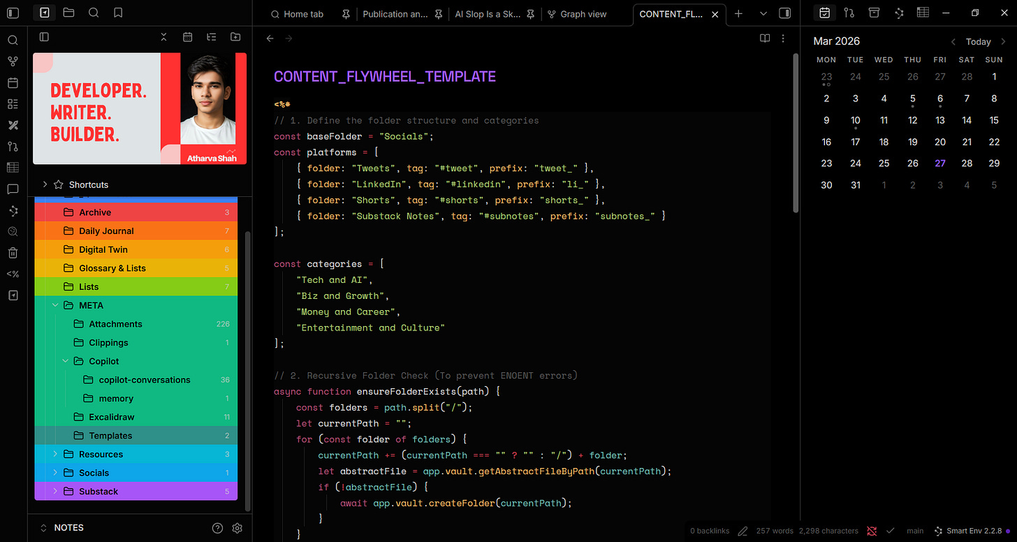Three rules governed every decision. First, locality. Every note is a .md file sitting in d:\Atharva\NOTES. If Obsidian disappears tomorrow, my entire knowledge base survives. Try that with Notion. Second, start fresh. I didn’t import my old mess from Google Docs. I let the structure earn its place organically, note by note. Importing old chaos into a new system just gives you organized chaos. Third, never delete. I don’t destroy notes. I move them to an Archive folder. Digital storage costs fractions of a penny per gigabyte. Regret costs a lot more.