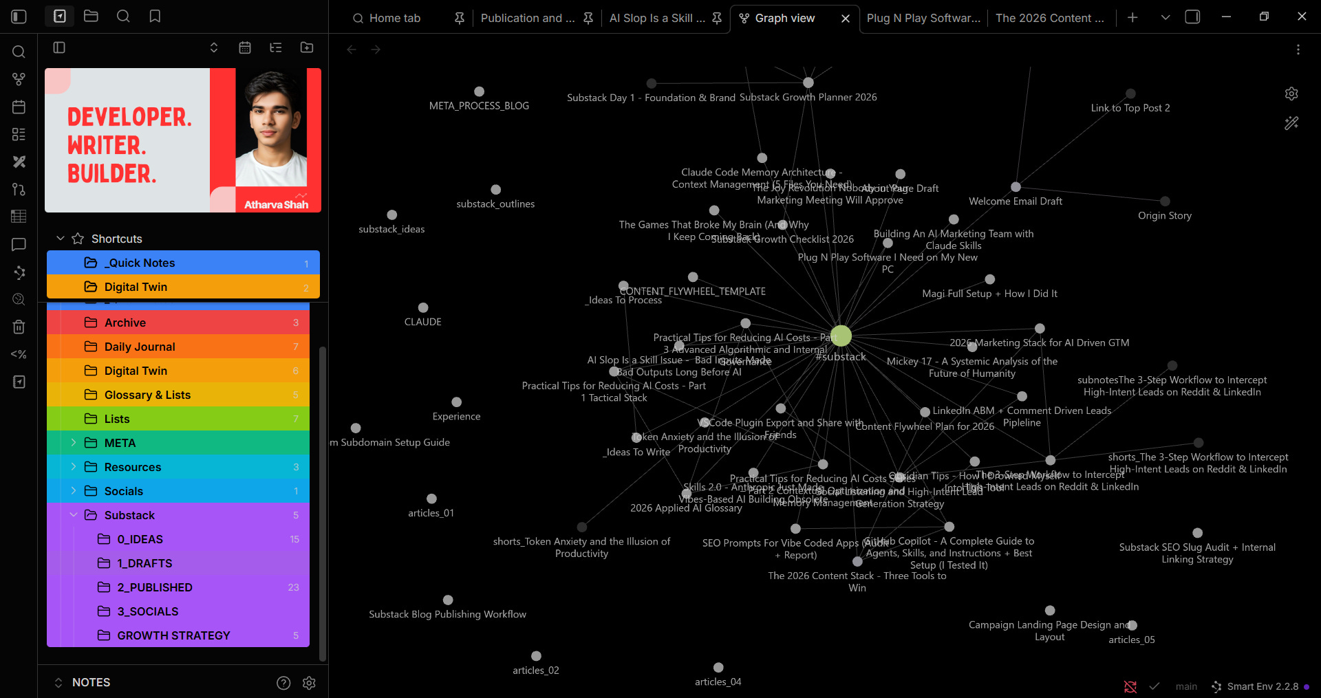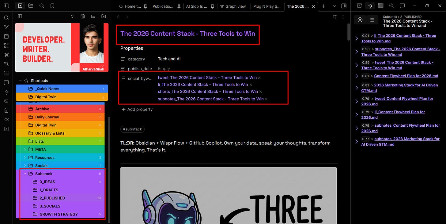 The Graph View alone justified the switch. It shows me relationships between ideas that I didn’t consciously create. I linked a note about cold email strategy to a note about content flywheels, and the graph revealed they both connected to a note about audience psychology I’d written weeks earlier. That kind of emergent structure doesn’t happen in a tool where notes live in isolated pages.
