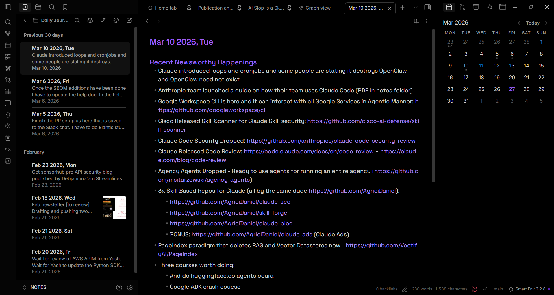 And everything lives in one place. Code snippets, long-form writing, task checkboxes, diagrams, journal entries, project plans. One vault. One search. One backup. The cognitive overhead of remembering which app holds which type of information drops to zero.