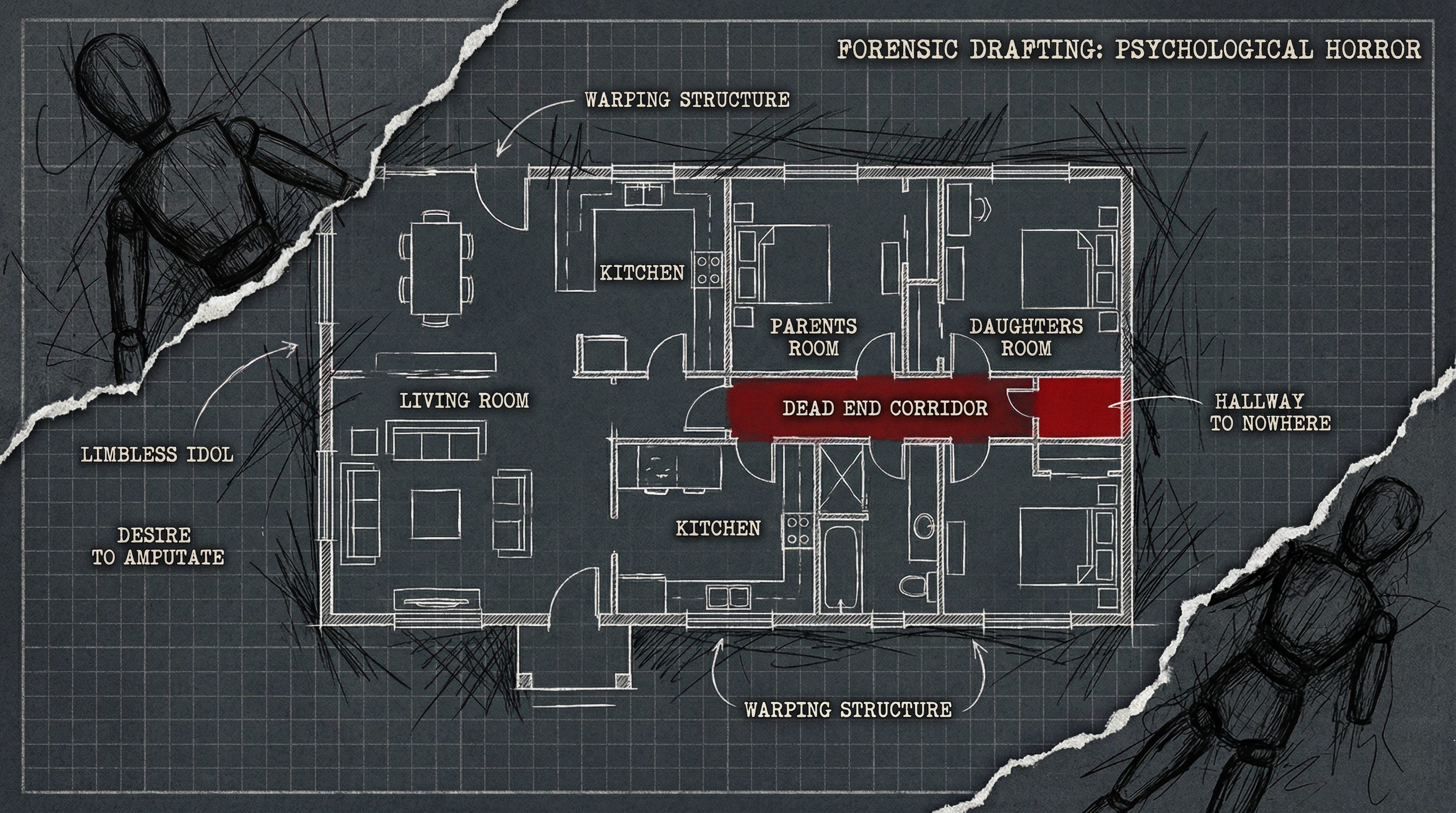 The “hallway to nowhere” is the novel’s entry point into its governing theme: houses as physical confessions of psychological guilt. The mother cannot walk past the place where a child died. She cannot live in a house whose front door opens onto that site. She is willing to destroy her daughter’s bedroom to correct the floor plan of her guilt.