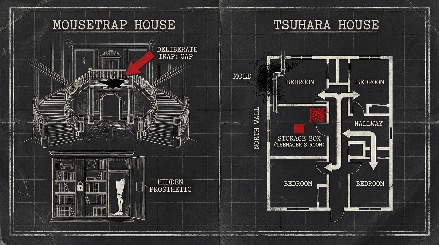 Years later, Shiori examines the floor plan and identifies the kill mechanism: the area at the top of the main staircase was designed with a wide gap, no wall, no handrail, specifically sized to be hazardous to someone with mobility impairment. Shiori theorizes that Mitsuko stole her grandmother’s walking stick during the night, locked it in the bookcase Shiori could witness was locked, and forced the old woman to navigate the staircase unaided. Shiori’s presence was the alibi.