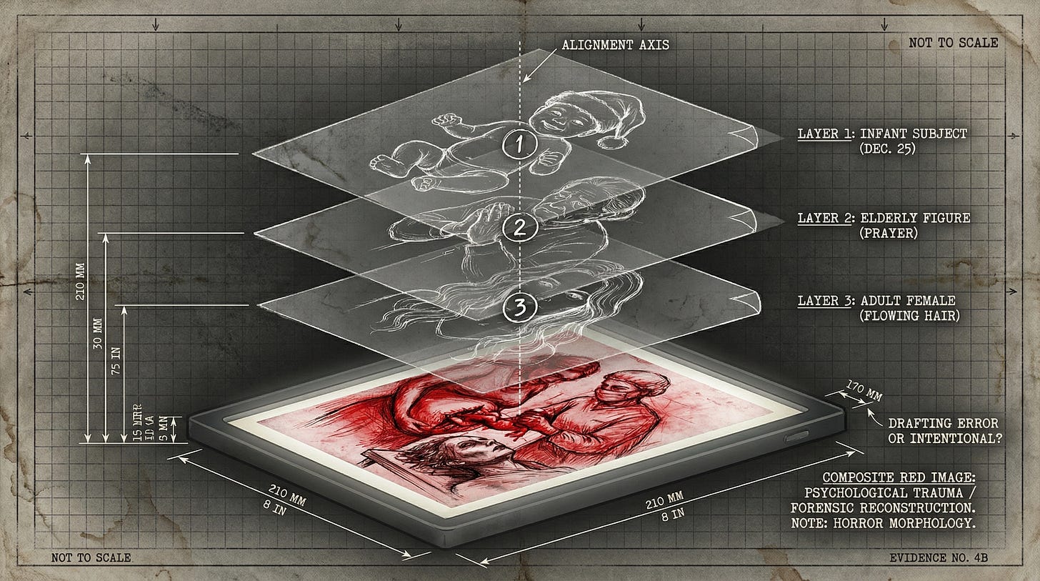 Sasaki cracks the drawings. He notices that each has a circled number. Yuki was a professional illustrator. She would know layer composition. Sasaki stacks drawings 1, 2, and 3, aligning their circles as central axes and scaling accordingly. The composite image is the worst thing in the book: drawing 1’s “Santa hat” becomes a bloody incision in a pregnant belly; drawing 2’s “praying old woman” becomes a doctor in scrubs pulling a baby from the wound; drawing 3’s “adult woman with flowing hair” becomes a stiff corpse on an operating table. Yuki had drawn a picture of her own murder, embedded across three innocent-looking images.