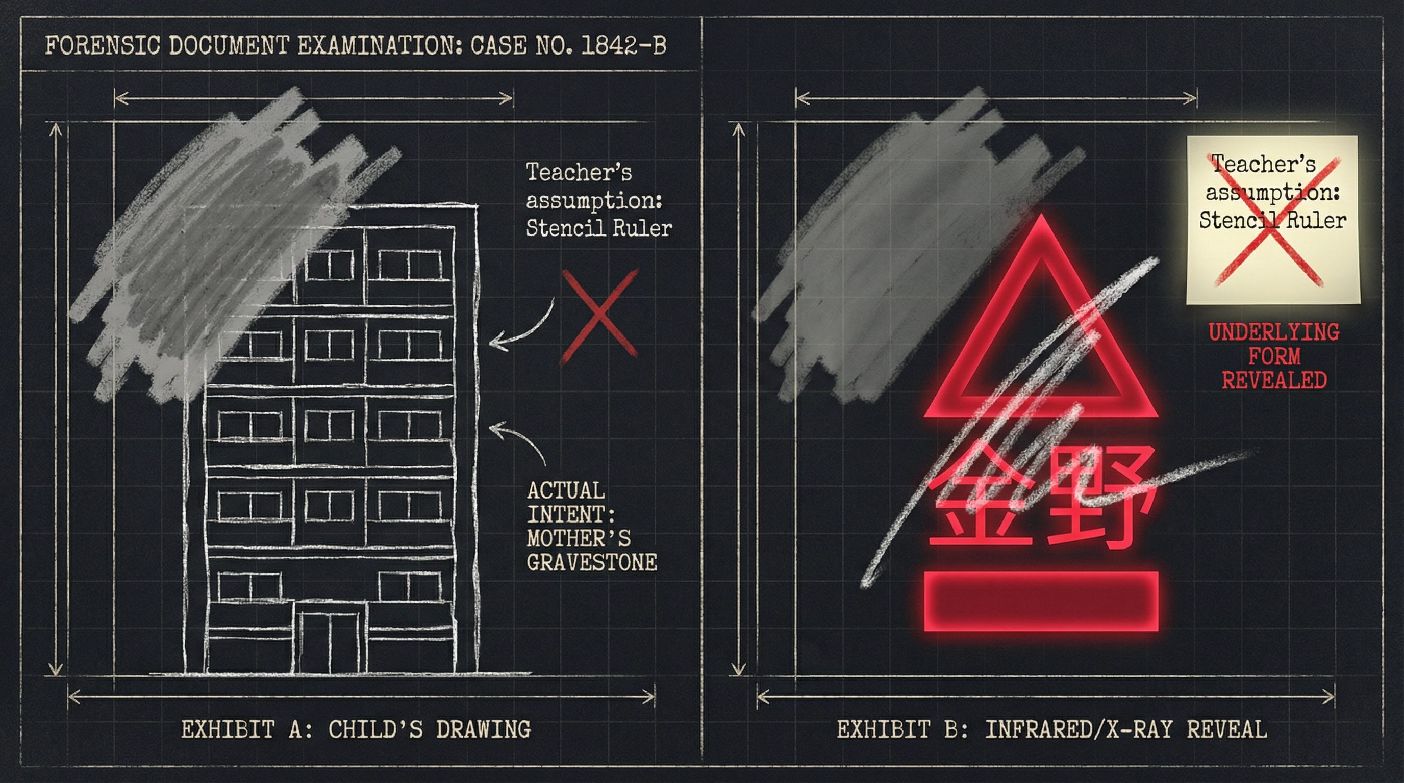 Yuta’s smeared drawing is the novel’s second major piece of ekphrasis. The grey blotch does not represent the stencil ruler, and it does not represent abuse. It represents Yuta desperately trying to erase a present reality and access a buried one. He is trying to draw through it, to the name of the dead woman he has never been allowed to know was his mother.