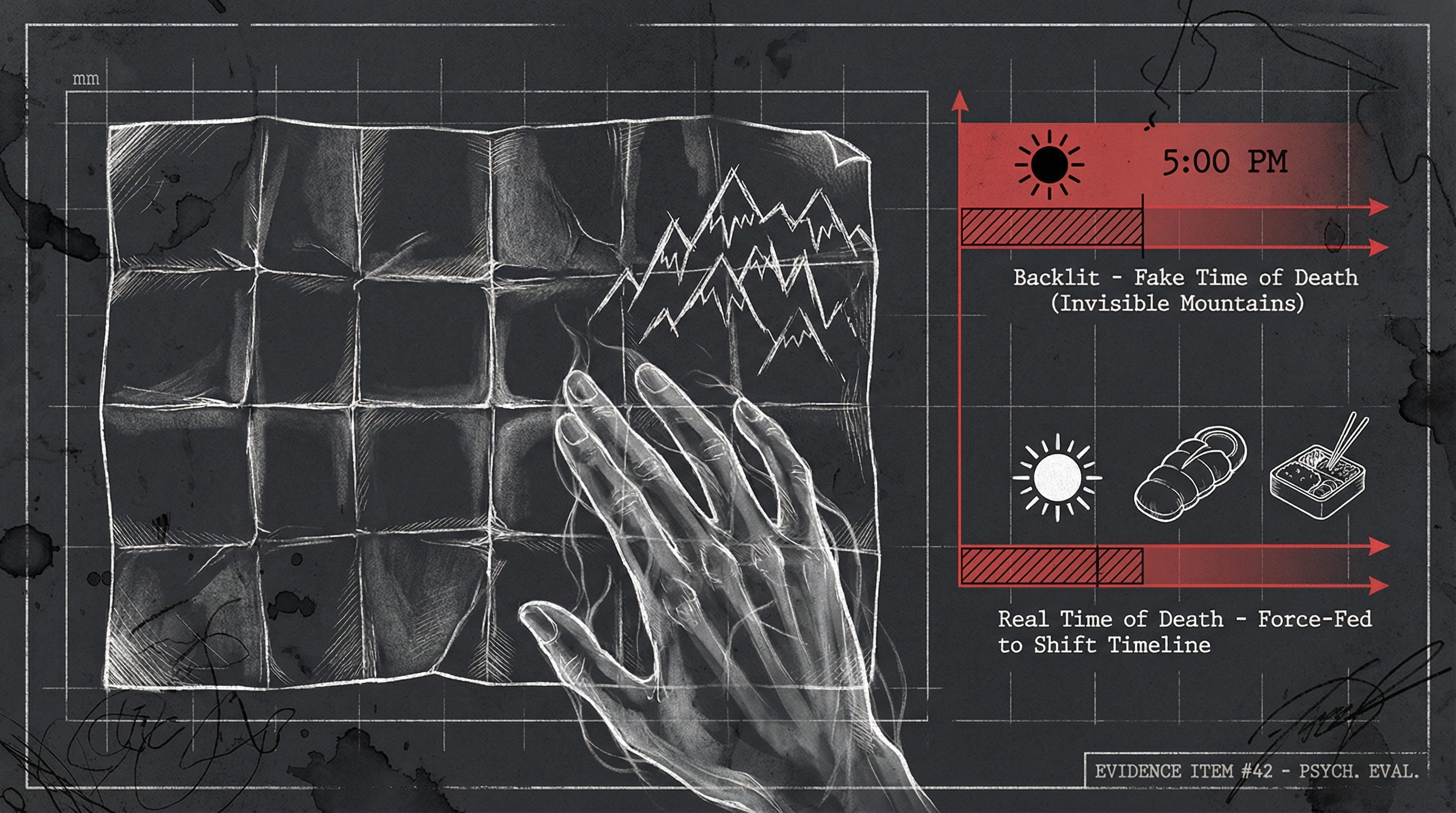 The crossing crease lines on Miura’s receipt drawing look like accidental folds. Iwata realizes they are tactile guidelines, folded deliberately so Miura could draw by feel with his hands restrained inside a sleeping bag. The creases are the proof that the time-of-death alibi was manufactured from start to finish.