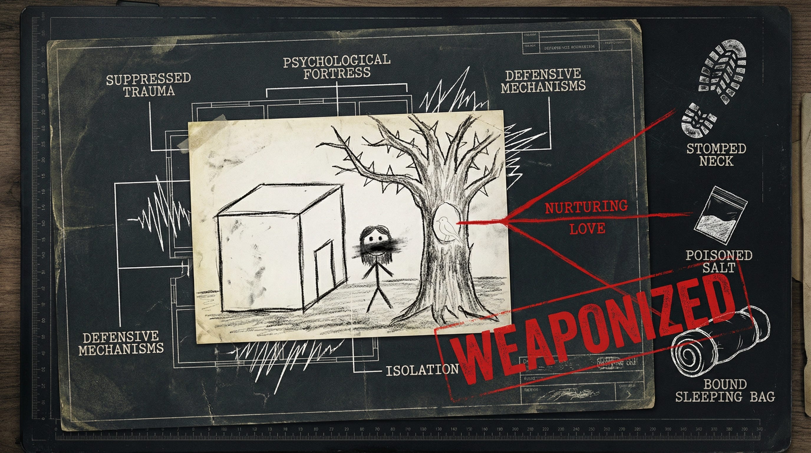 Dr. Hagio walks her students through three anomalies in the drawing. First, the figure’s mouth is heavily smudged. Hagio reads this as physical trauma memory: the child’s hands trembled as she recalled being forced to smile constantly to appease her abuser. Second, the house lacks a door. Hagio interprets this as a fortress mentality, a desire to lock the world out. Third, the tree’s branches end in sharp, thorny points, a trait frequently observed in drawings produced by violent offenders, indicating deep aggression.