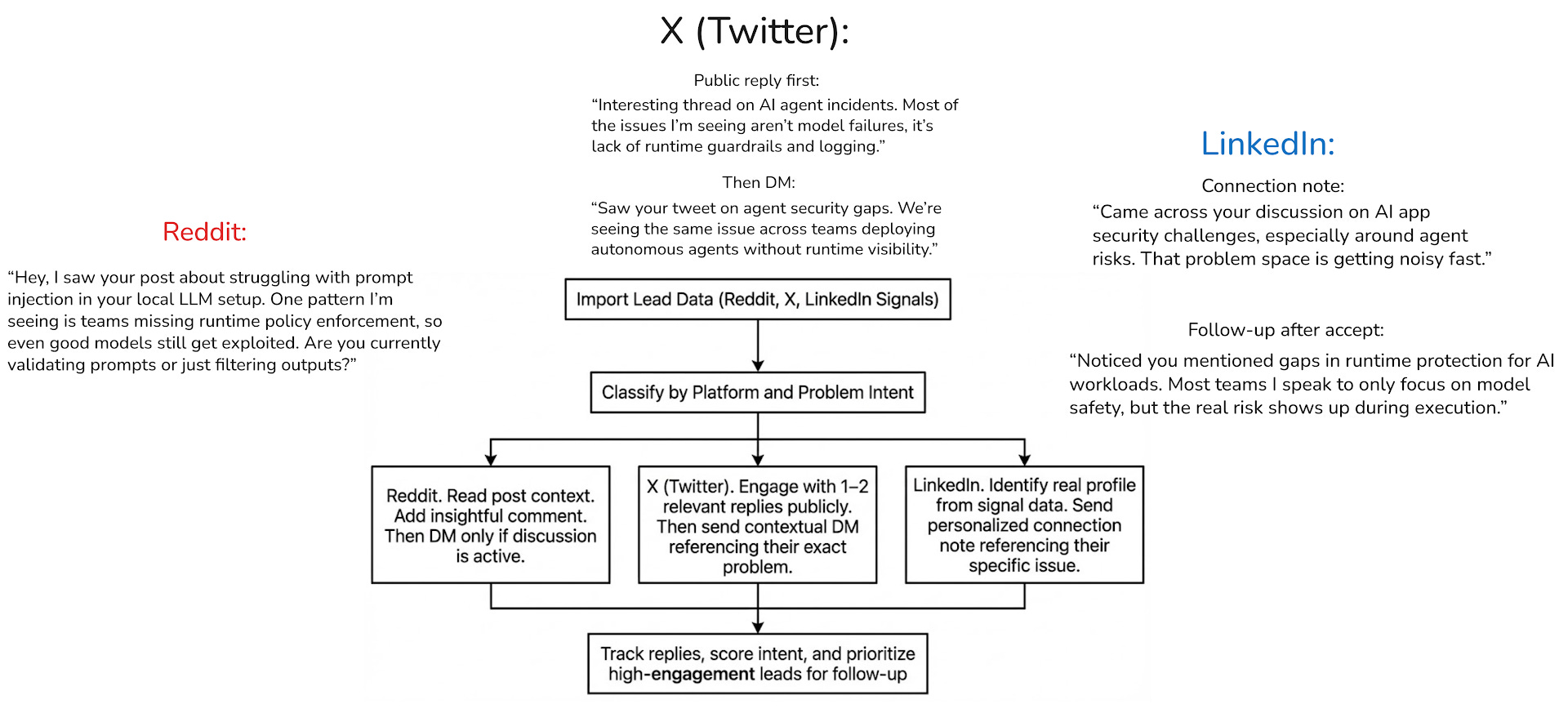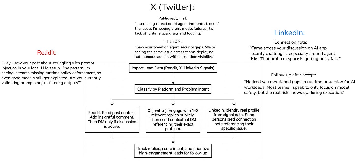 The second signal is technical problem-solving. A post like “How are people securing LLM agents against prompt injection in production?” tells you someone is building right now and hitting a wall. They do not want a pitch. They want an architecture diagram, a code snippet, or a link to something that actually explains the solution. You provide that, and you have positioned your tool as the infrastructure layer beneath their entire stack. The sale comes later. The trust starts here.