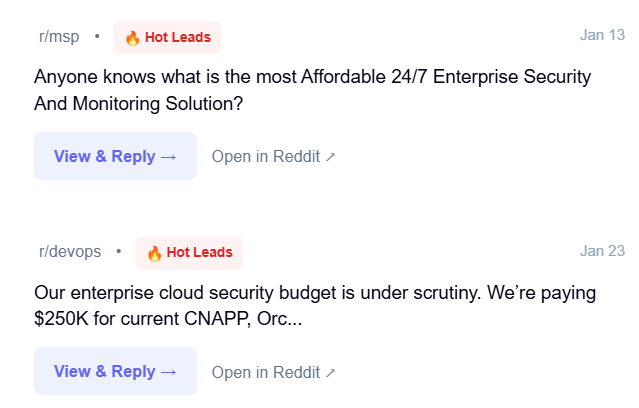 Now compare that to intercepting a Reddit thread where a VP of Engineering is publicly asking “What CNAPP tools actually do runtime visibility well?” That person is already in-market. They have budget context. They have a problem that hurts today, not hypothetically. The cost to engage? Nearly zero. A well-crafted reply that adds genuine value. No ad spend. No sequence. No prayer.