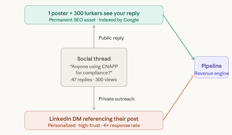 The public angle is your reply in the thread itself. This captures the lurker audience - the 90% of people who read but never post. Your reply is not for the person who asked the question. It is for the three hundred people silently reading the answers. The private angle is a LinkedIn message or email that references the specific technical question they asked publicly. “I saw your post about runtime visibility gaps - we actually solved that exact problem for [similar company]. Happy to share how.” That message gets a response rate that would make your outbound team weep.