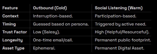 That is the real unlock. Outbound fills a quarter. Social listening builds a moat.
