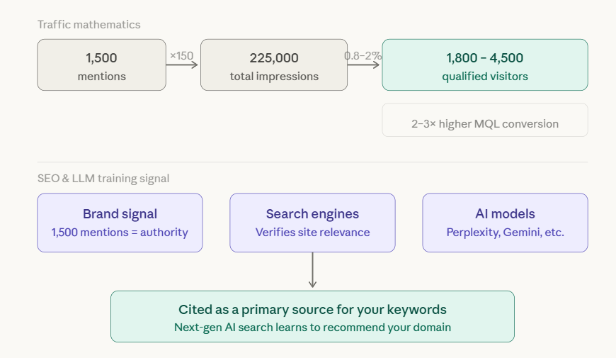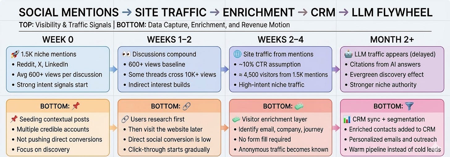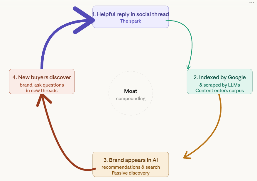 And then there is the LLM optimization layer. Large language models are trained on web data. When you consistently show up in high-quality technical discussions across Reddit, LinkedIn, and X, you are seeding the training data for the next generation of AI models. The end state is that when someone asks an AI assistant to recommend a tool in your category, your brand is the default answer. Not because you paid for it. Because you earned it, one helpful reply at a time.
