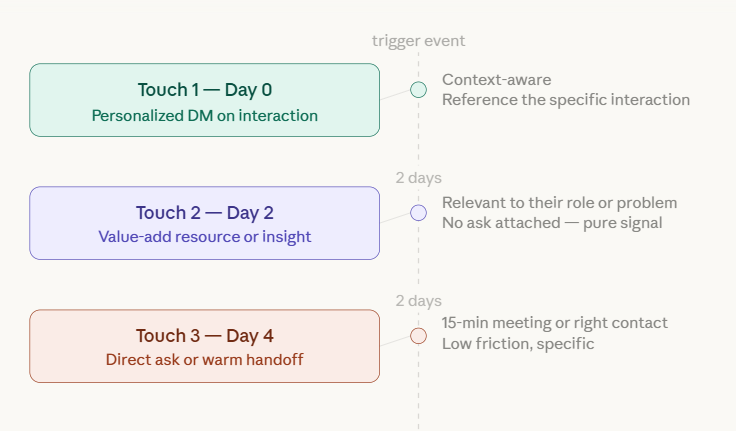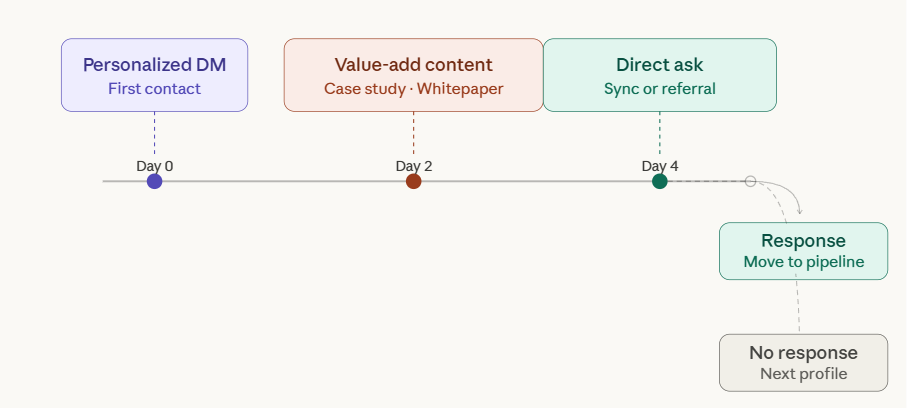 Three touches. Four days. If there is no response after that, move on. Your Dream List has sixty-nine other profiles this week.