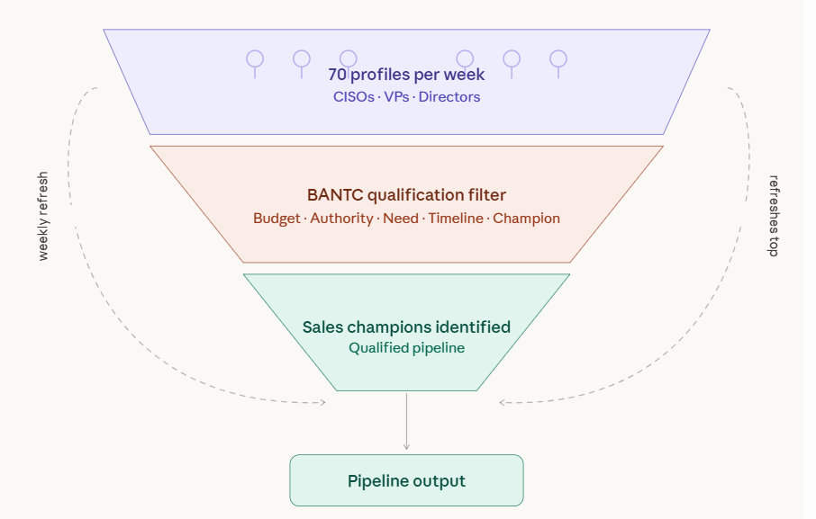 Here is where it starts. You pick 10 high-value profiles per day. Seventy per week. Every one of them fits a tight profile — the right title, the right domain, the right level of authority. Decision-makers with real problems and real budget. The kind of people who aren't waiting to be sold to — they're already looking for a solution.