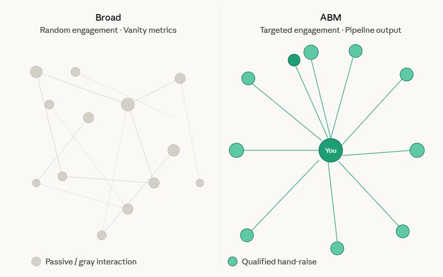 Broad engagement gives you vanity metrics. Likes that lead nowhere. Followers who never buy. The ABM approach gives you a pipeline of identified champions inside target accounts - people who have already engaged with your thinking and know your name before the first call.