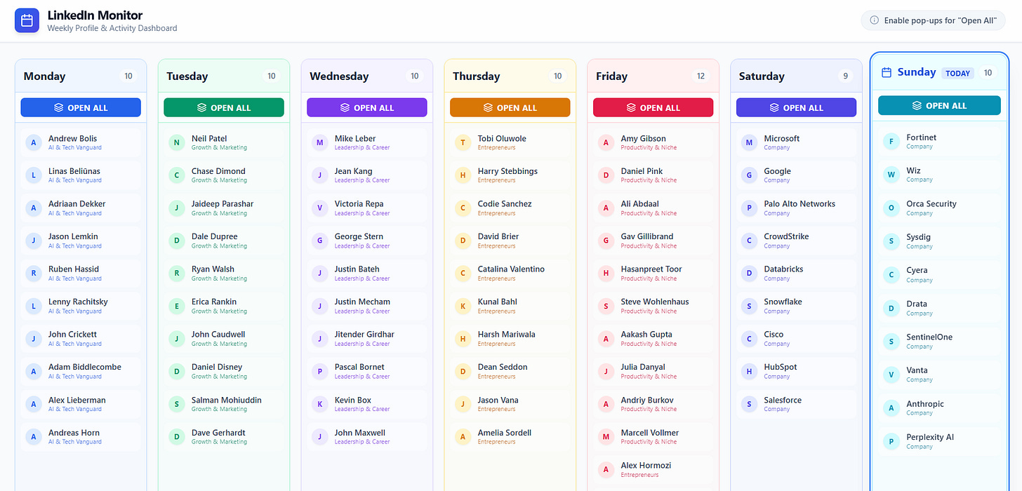 Log them. Track them. A simple spreadsheet works - 7 days, 10 companies per day, 5-6 comments on their posts. Refresh the list every two to three months so you are never chasing dead accounts.
