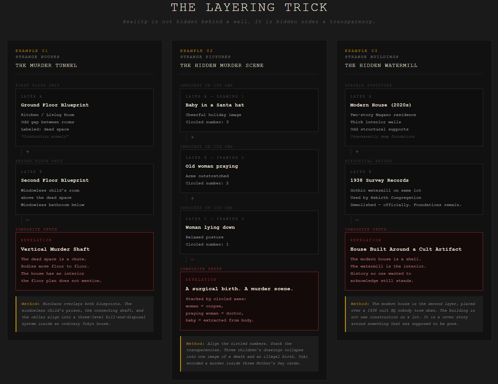 Floor plans appear in the text. Drawings appear in the text. The reader holds the same evidence the characters do, at the same time they do. This is not a gimmick. In Strange Pictures, the reader can actually perform the “layer composition” — stack the three drawings over their circled axes — and see the composite murder image Yuki hid inside three innocent-looking sketches. In Strange Houses, the reader can overlay the two floor plans and find the dead space themselves.