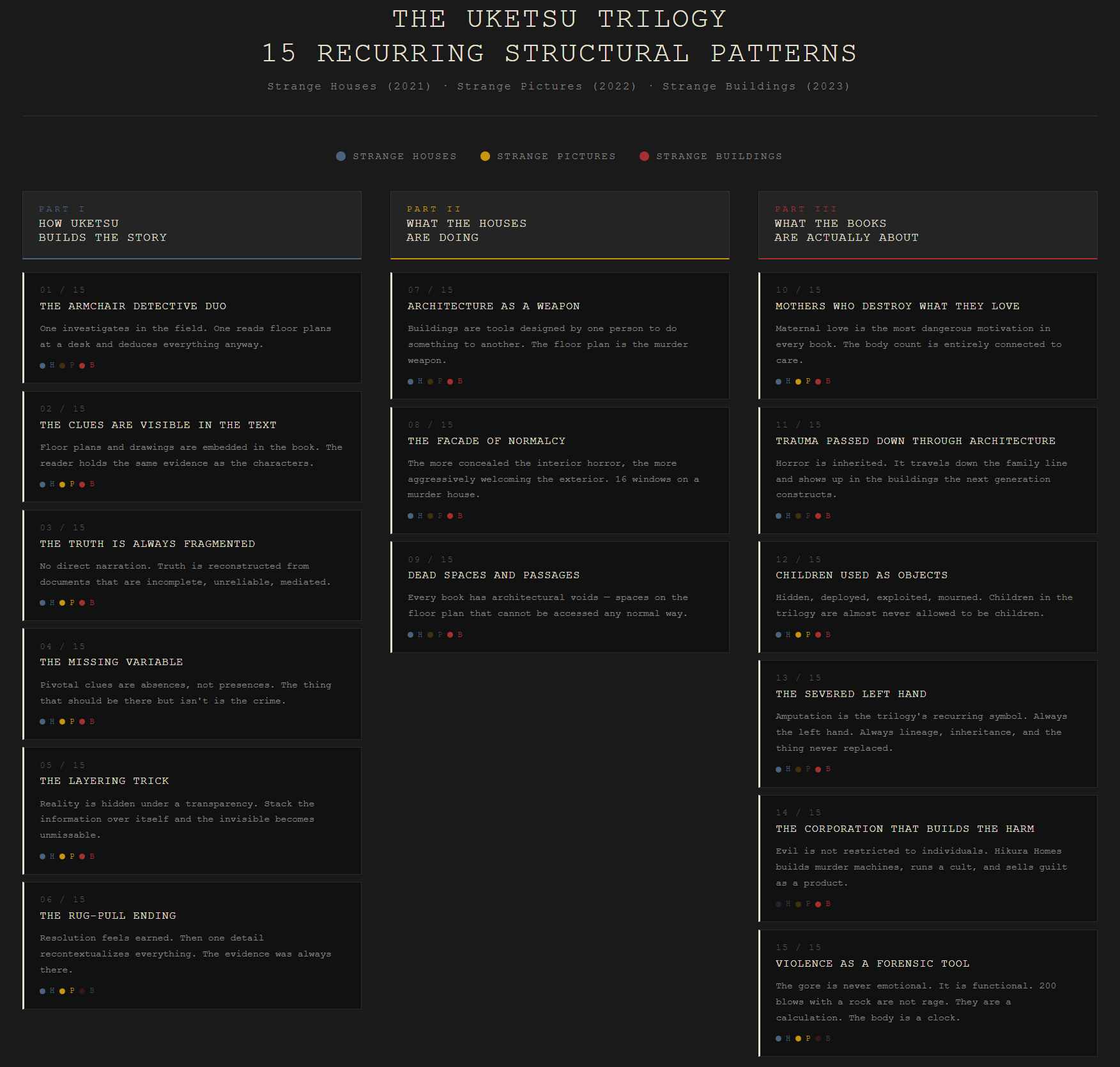 Uketsu wrote three novels. They look like puzzle-box mysteries. They read like horror. Under the surface, they are a sustained argument about the same set of ideas, told through architecture, psychology, and the specific violence of people who love something too much.