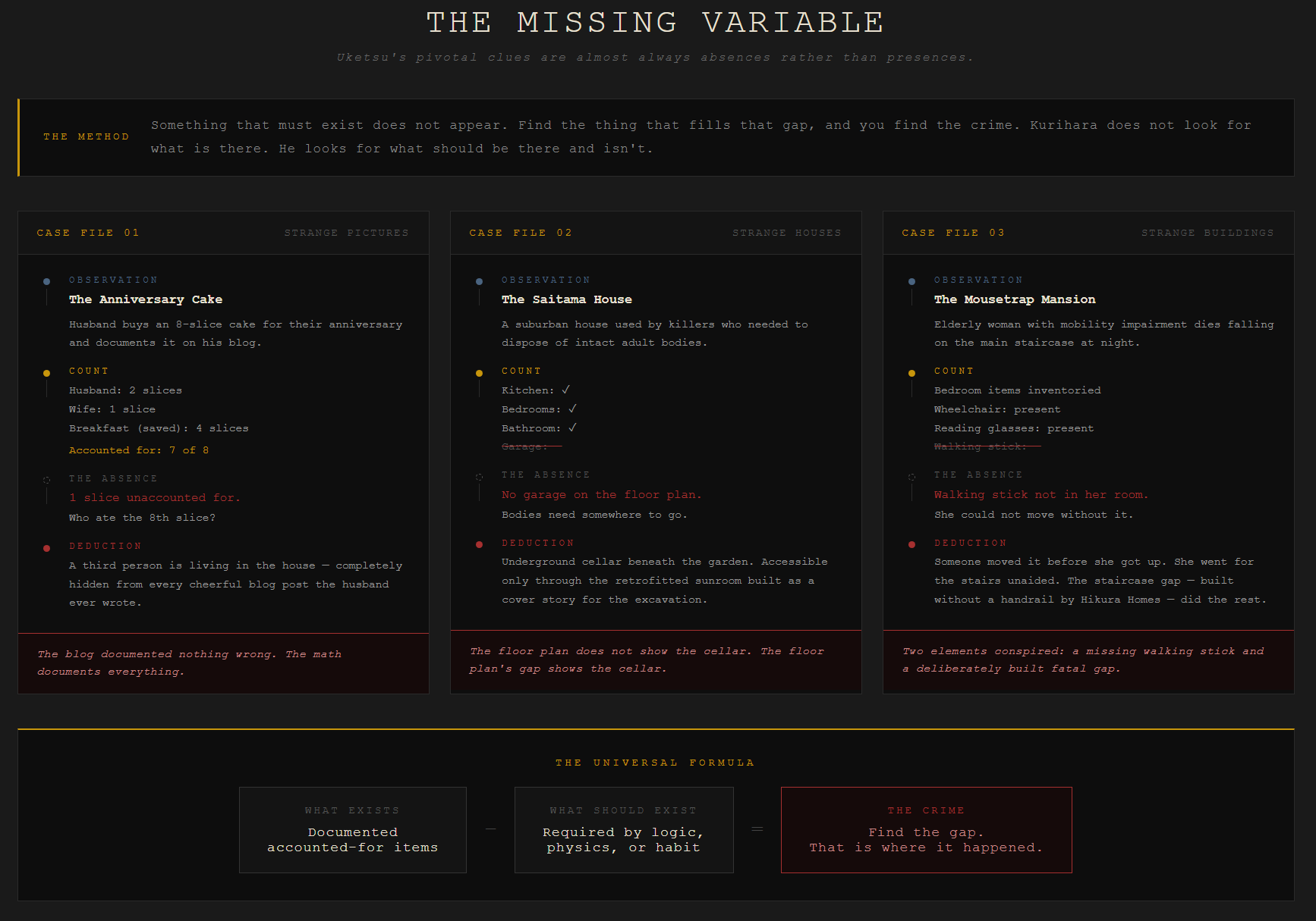 Uketsu’s pivotal clues are almost always absences rather than presences. Something that should be there is not. Something is missing from the count.