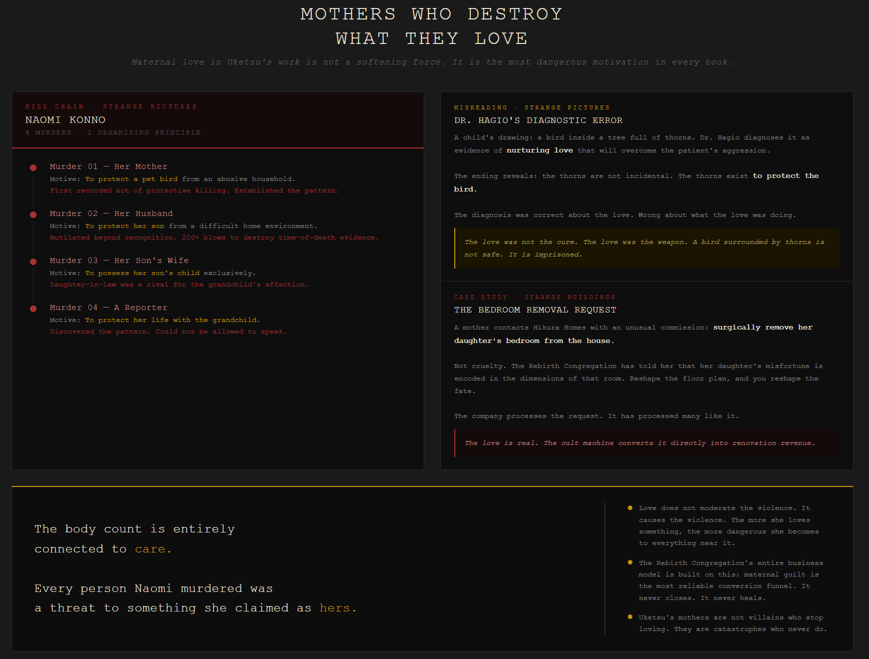 Maternal love in Uketsu’s work is not a softening force. It is the most dangerous motivation in every book.