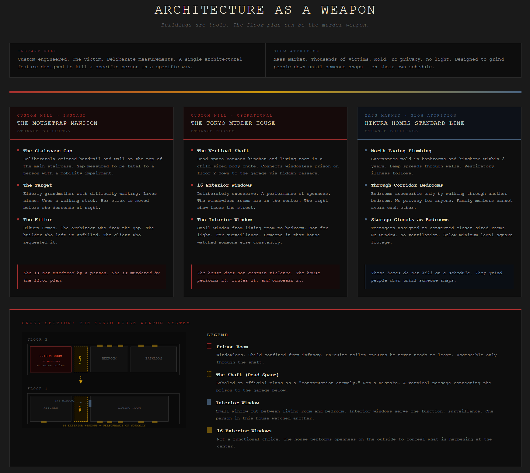 Hikura Homes also produces mass-market homes with north-facing plumbing that guarantees mold, bedrooms arranged as through-corridors with no privacy, and converted storage closets assigned as teenagers’ bedrooms. These homes do not kill on a schedule. They grind people down until someone snaps.
