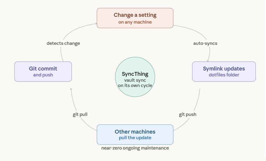 Your dotfiles stay current with zero extra effort. Every machine pulls the latest version on the next sync.