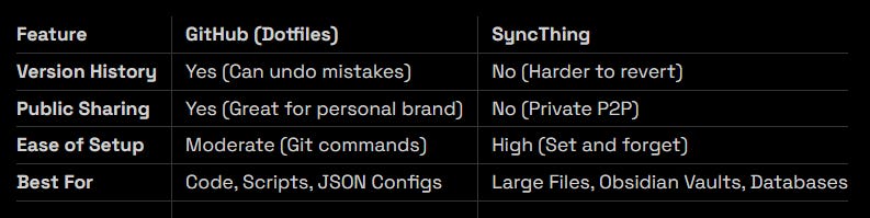 Use GitHub for the logic - scripts and small text-based configs where you want version control and rollback. Use SyncThing for the data - your Obsidian vault, images, media libraries, and local databases where you want seamless, set-and-forget synchronization. Running both gives you the best of each world.
