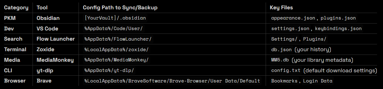 Installing apps is the easy part. The hard part is making them feel like yours. That means restoring settings, themes, keybindings, and databases. SyncThing keeps a folder called C:\Backup\Config synced across all your machines. The table below maps exactly which paths need to be tracked for each tool.