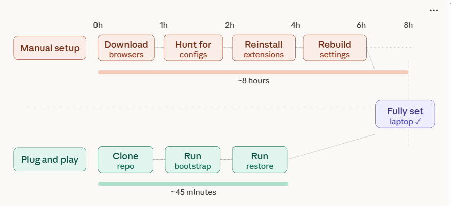 With the repo set up, your entire migration on a new laptop becomes a single line: