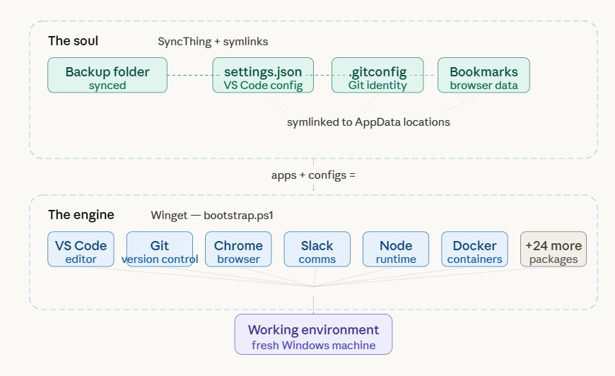 To make this truly plug-and-play, the system has two layers. The first is the engine - Winget installs the software binaries. The second is the soul - SyncThing plus symlinks restore your actual settings, themes, and databases. Installing the apps gets you 60% there. Restoring the configs gets you the remaining 40% that makes it feel like your machine.
